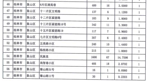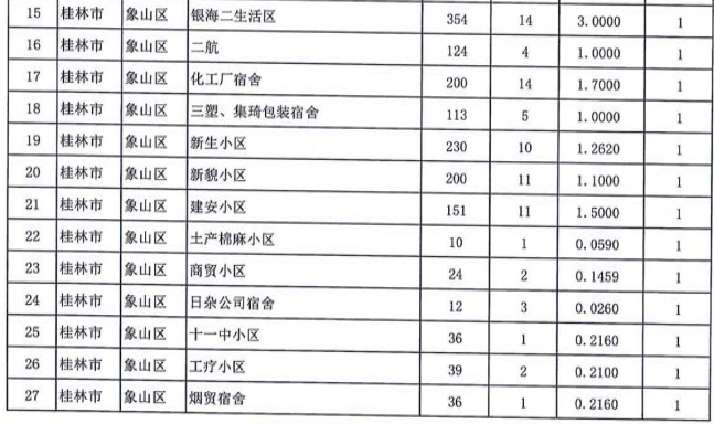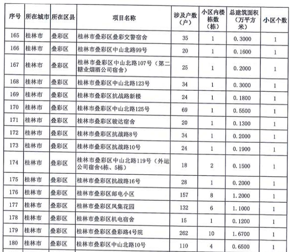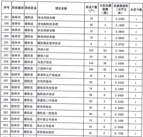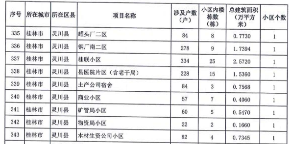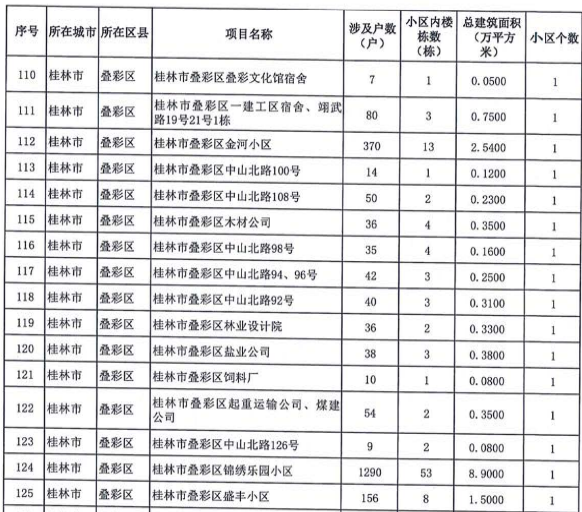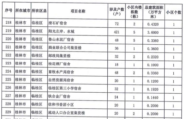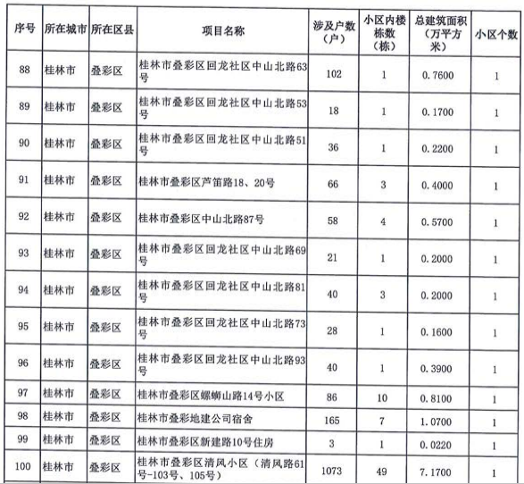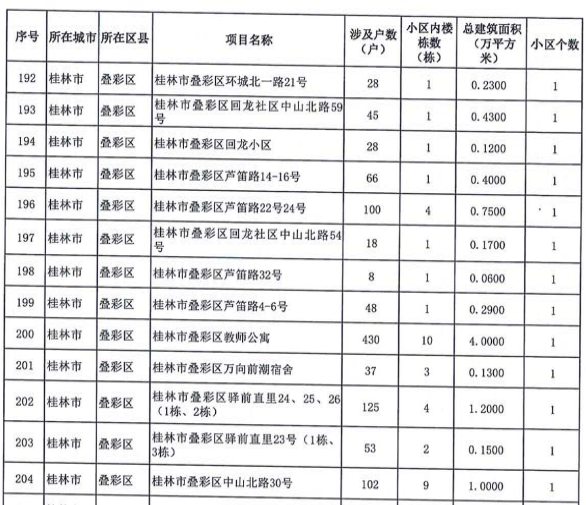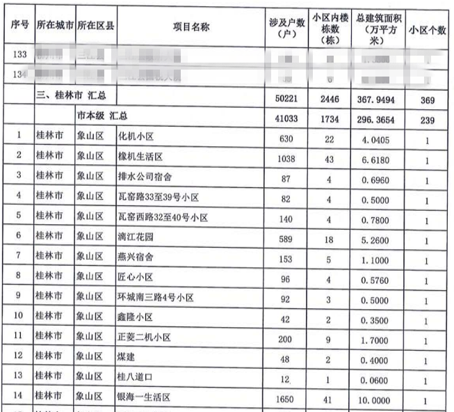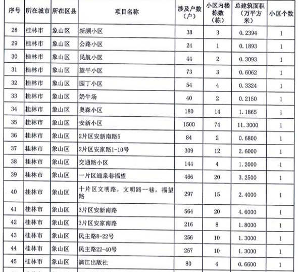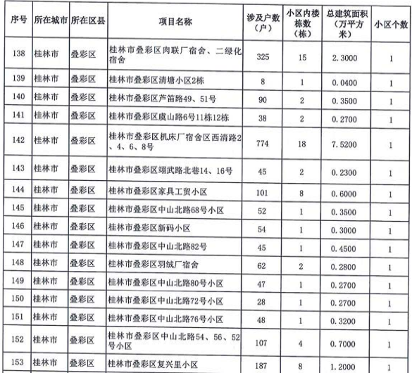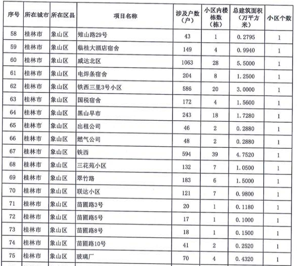 改造的小区涉及象山区、秀峰区、叠彩区、七星区、临桂区、灌阳县、兴安县、平乐县、资源县、灵川县、恭城县、全州县、阳朔县,快看看有你家吗?
