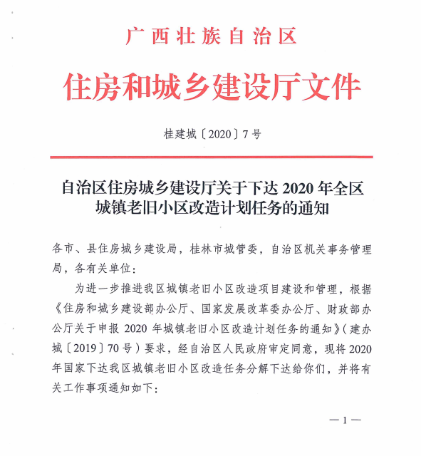 日前,《自治区住房城乡建设厅关于下达2020年全区城镇老旧小区改造计划任务的通知》(桂建城〔2020〕7号)正式发布。