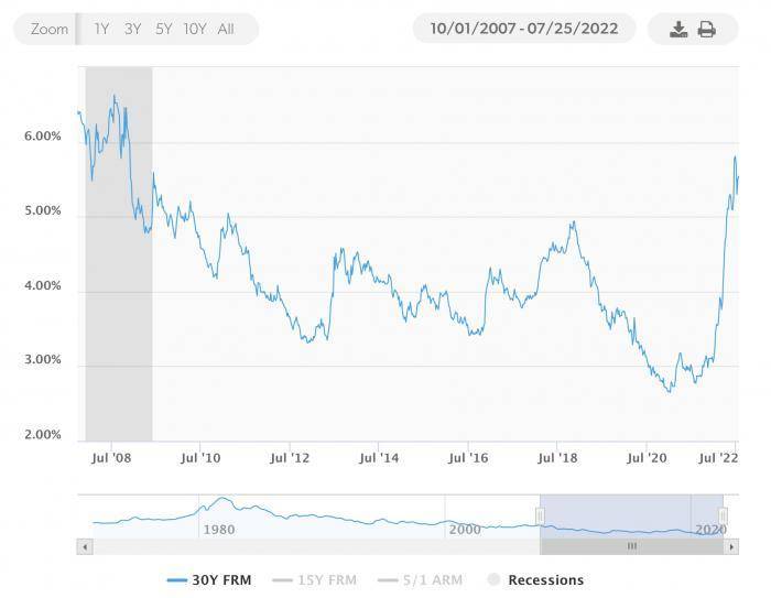 美国住房抵押贷款金融巨头房地美(Freddie Mac)数据显示,截至7月25日,美国30年期抵押贷款平均利率为5.54%,略低于6月的高点5.81%,但仍处在十多年来的高位附近。而且鉴于美联储接下来还将大力加息,美国房贷利率或仍有上涨空间。