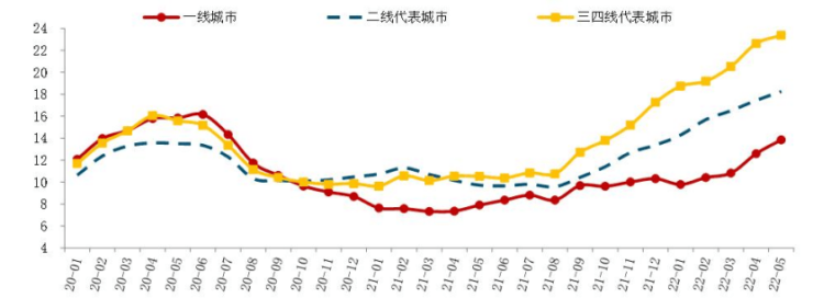 其中,截至2022年5月底,按近6个月月均销售面积计算,一线城市短期库存出清周期13.9个月;二线代表城市出清周期18.3个月,较2021年末延长4.9个月,短期库存面临一定压力;三四线代表城市出清周期23.4个月,较2021年末延长6.1个月,市场库存去化压力较大。