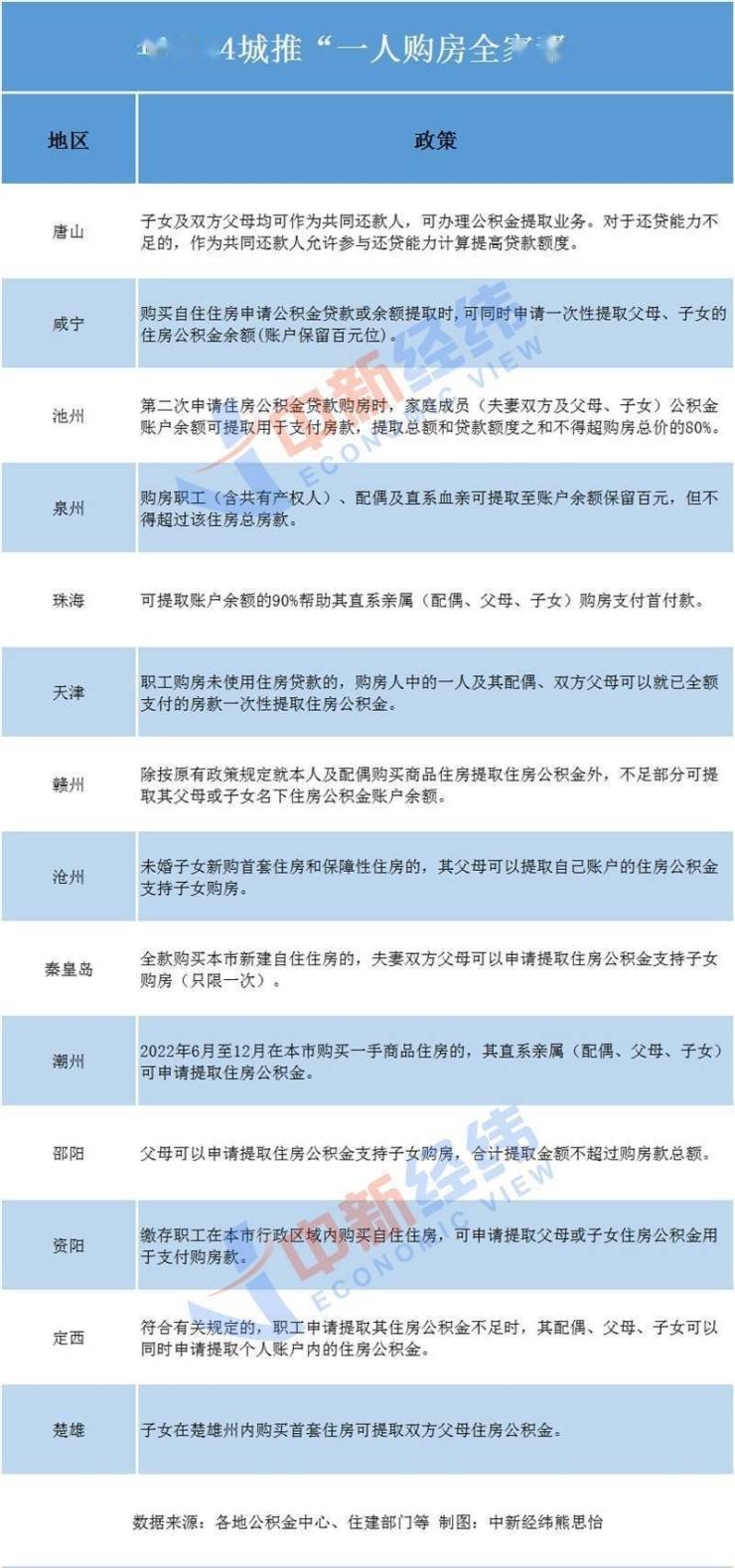 近期,多地调整公积金贷款政策,除提高贷款额度、降低首付比外,唐山、咸宁、池州、泉州、珠海、天津、赣州、沧州、秦皇岛、潮州、邵阳、资阳、定西、楚雄等还允许直系亲属提取公积金余额帮助购房人还贷。