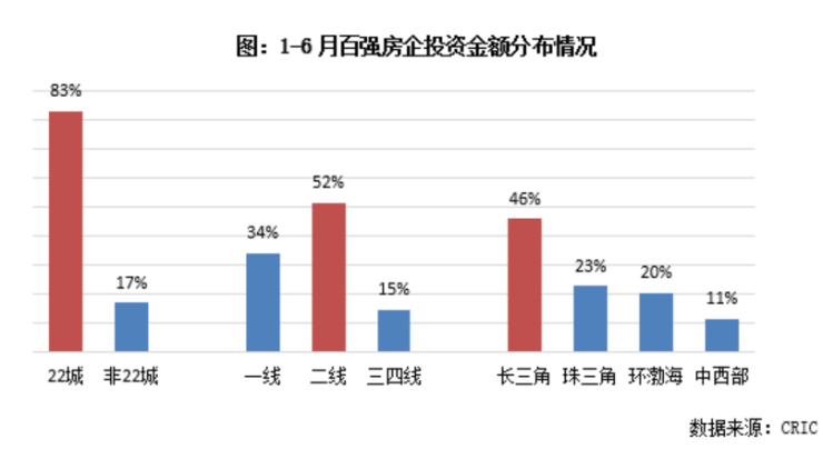 克而瑞数据显示,上半年,销售百强房企83%的投资金额集中在22个试点集中供地的核心城市,龙湖、建发、华润等房企均有八成以上金额投资于集中供地城市。